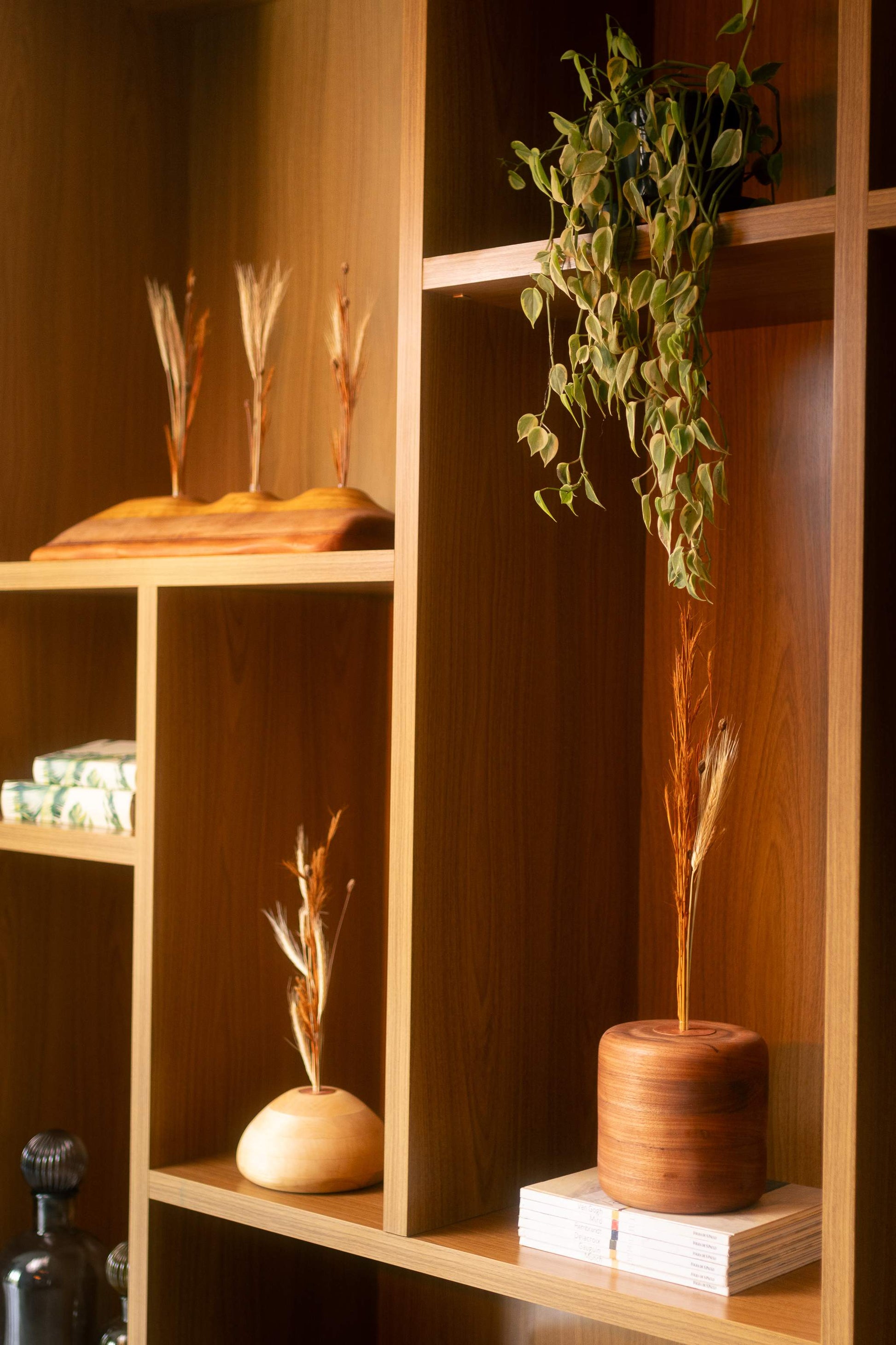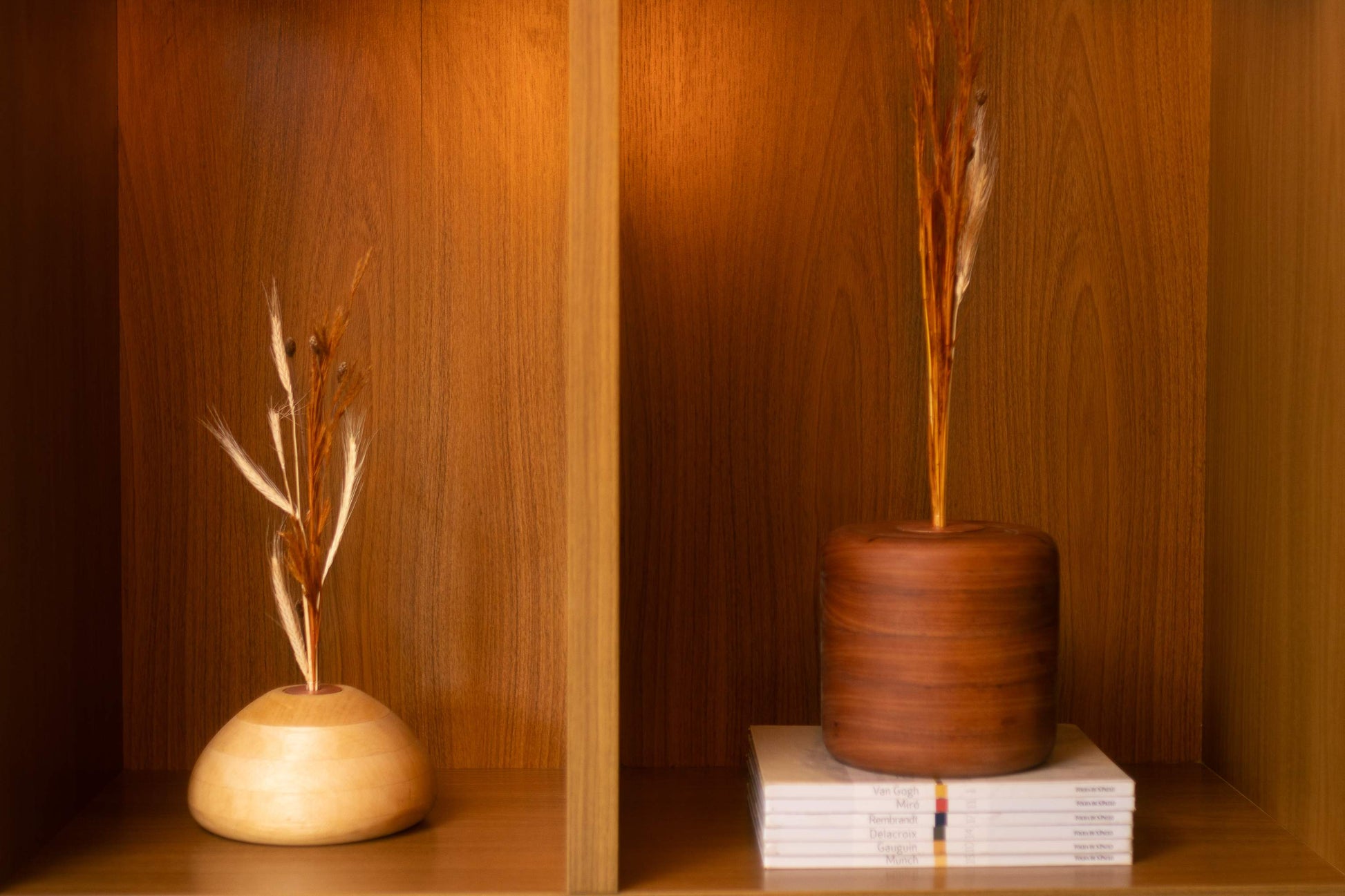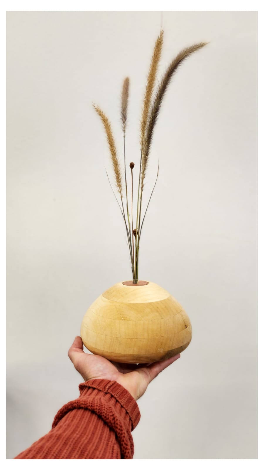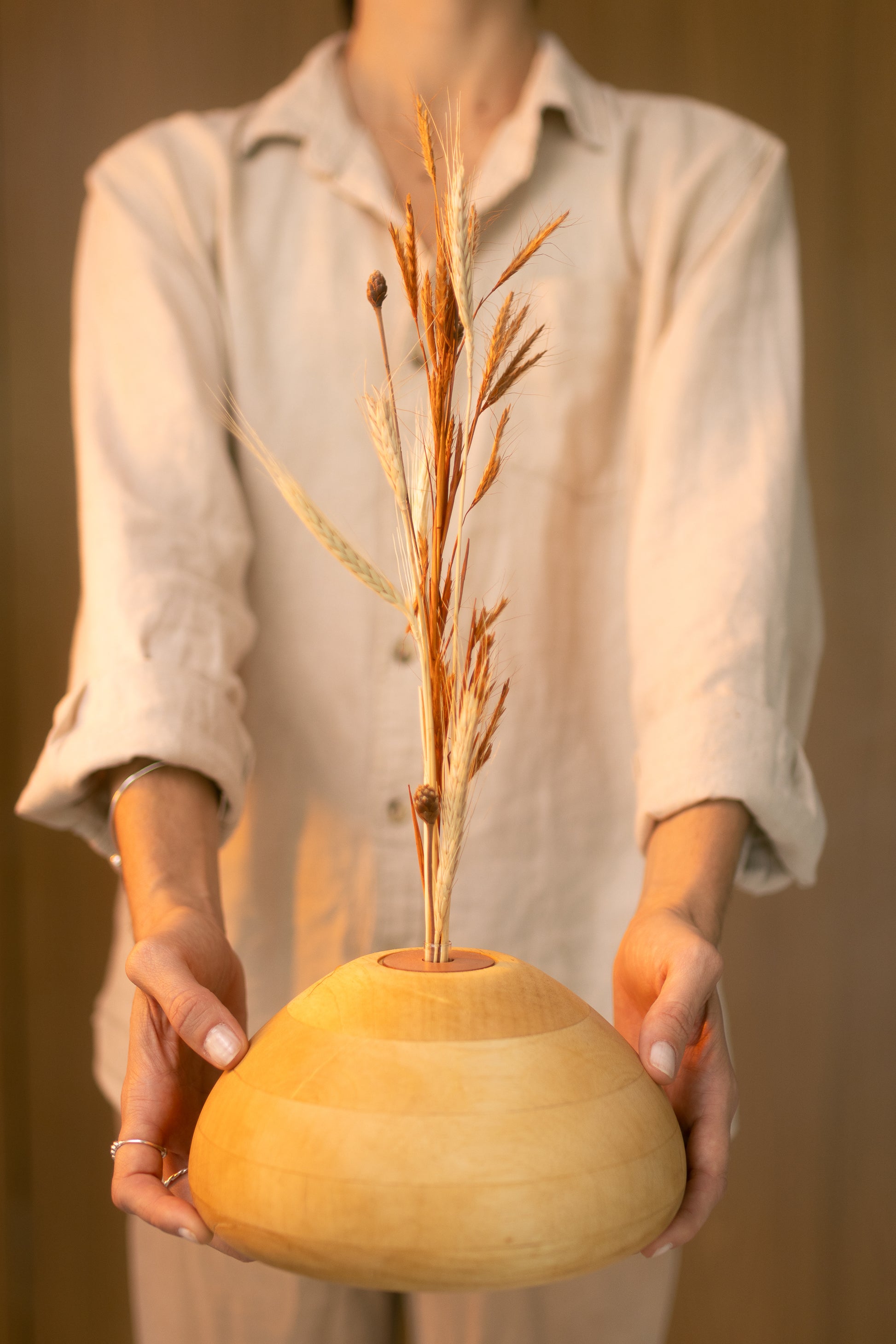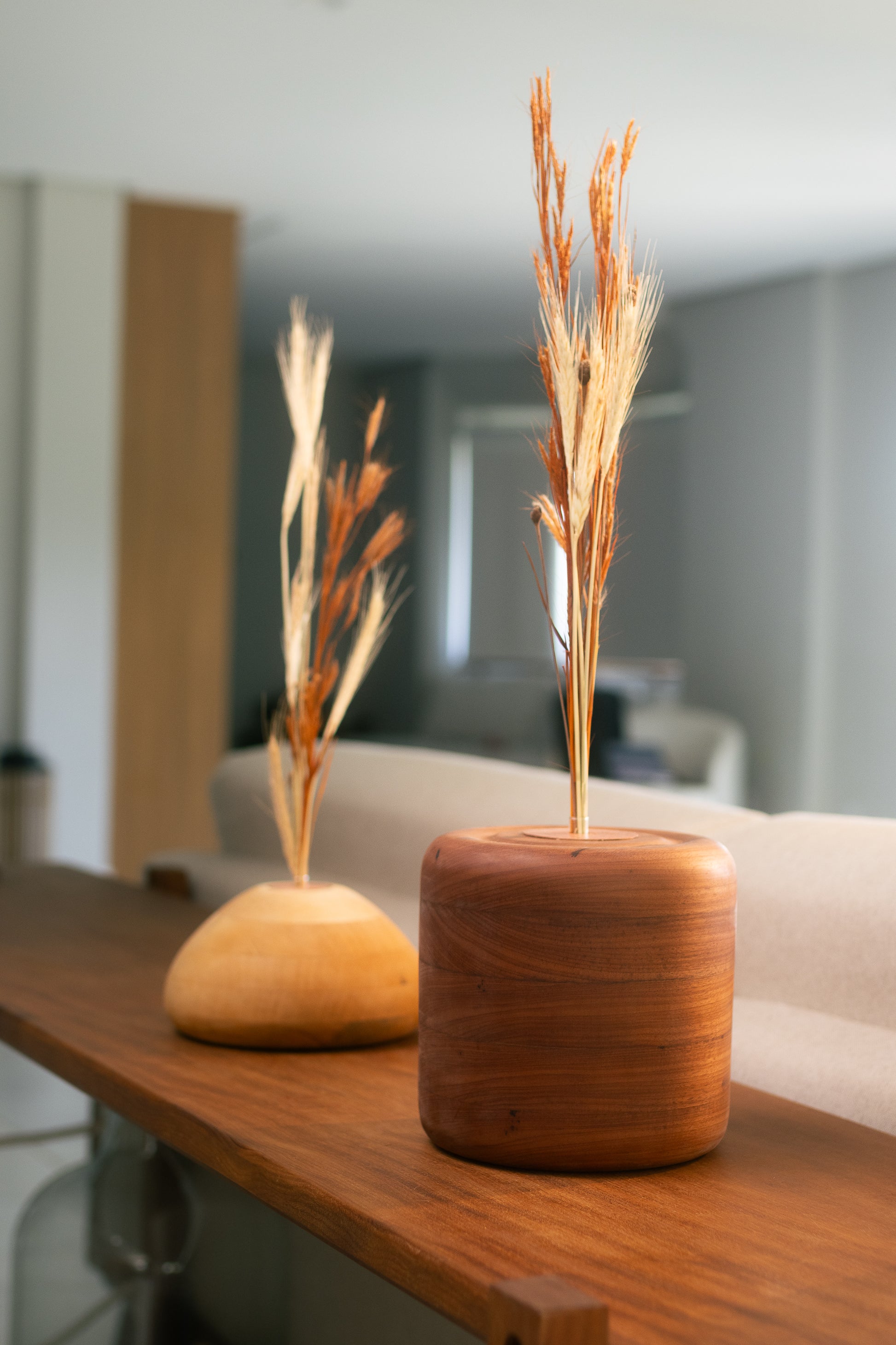 Vaso torneado em madeira Marupá com tubo de ensaio na parte interna, permitindo pequena quantidade de água. Detalhe circular em cobre polido.